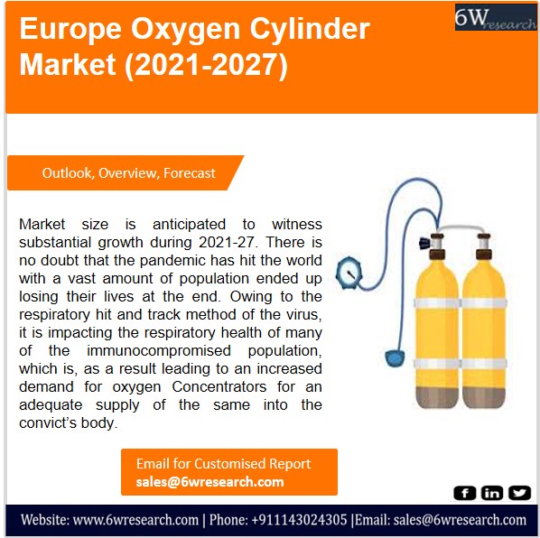 According to 6Wresesarch, Europe Oxygen Cylinder Market size is anticipated to witness substantial growth during 2021-27. There is no doubt that the pandemic has hit the world with a vast amount of population ended up in losing their lives at the end. Owing to the respiratory hit and track method of the virus, it is impacting the respiratory health of many of the immunocompromised population, which is, as a result leading to an increased demand for oxygen Cylinders for adequate supply of the same in to the convict’s body. This has gradually shoot up the demand for medical oxygen Cylinders not only in hospitals and ambulatory surgical centres, but also in home health care setups. As a result, the market for oxygen Cylinders has been witnessing sky rocketing growth since the pandemic has hit upon the world, and as the graph is nowhere expected to fully drain in the coming short interval of time, sound growth prospects for the product market are expected to be witnessed in the upcoming three years.